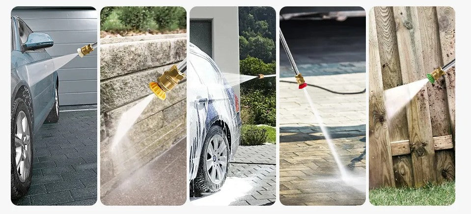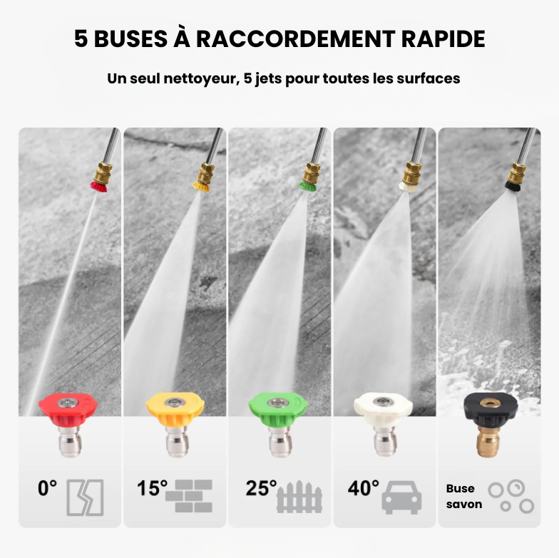 Les différentes buses permettent d’ajuster le jet pour les voitures, terrasses, pavés, murets, clôtures en bois et autres surfaces extérieures.